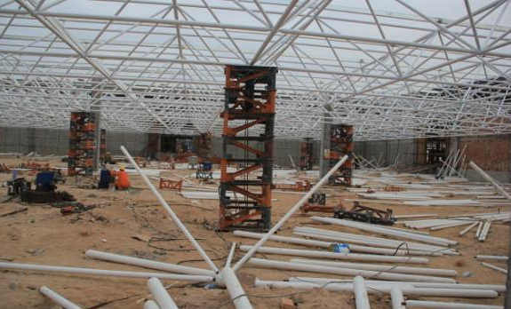 5)总体晋职法:此步履多使用在周边支护以及有多点支护的网架结构,可采取平板升降机、液压千斤顶等小型机具作业南开施工;